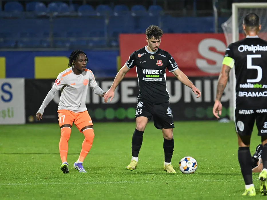 Moses Abbey si Kevin Andrei Ciubotaru in meciul de fotbal dintre Metaloglobus Bucuresti si FC Hermannstadt, contand pentru Superliga Superbet, desfasurat pe Clinceni Arena din Clinceni, luni 24 noiembrie 2025. © FOTO:Razvan Pasarica/SPORT PICTURES