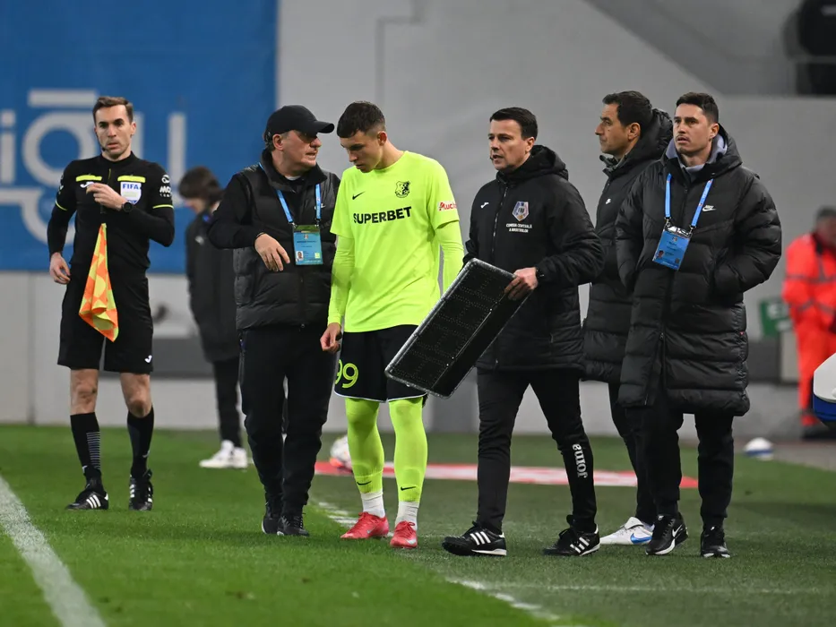 Arbitrul asistent Mihai Marius Marica, Gheorghe Hagi, Albert Iustin Doicaru, arbitrul de rezerva Catalin Busi si Cătălin Cristian Anghel la schimbare la meciul dintre Universitatea Craiova si Farul Constanta, contand pentru Superliga Superbet, desfasurat pe Stadionul Ion Oblemenco din Craiova, sambata 1 martie 2025. © FOTO:Razvan Pasarica/SPORT PICTURES