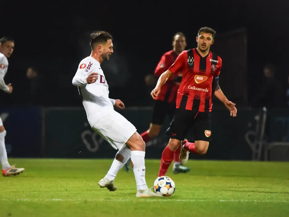 Damjan Djokovic si Szilárd Veres in meciul de fotbal dintre FK Csikszereda Miercurea Ciuc si FC CFR 1907 Cluj, contand pentru Superliga Superbet, desfasurat pe Stadionul Municipal din Miercurea Ciuc, joi 16 octombrie 2025. © FOTO:Zoltan Pal/SPORT PICTURES
