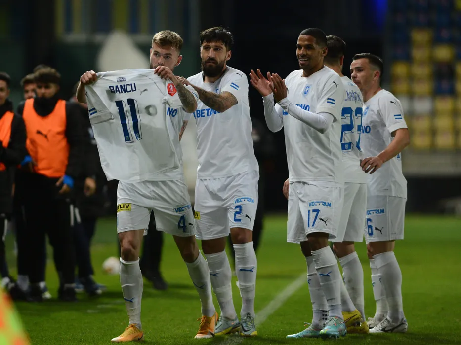 Alexandru Cretu se bucura dupa un gol marcat alaturi de Cristian Mihai Capatina, Paul Papp, Dan Nicolae Nistor si Vitor Ferreira Mosac Rivaldo in meciul de fotbal dintre Chindia Targoviste si Universitatea Craiova, contand pentru Superliga Superbet, desfasurat pe Stadionul Ilie Oana din Ploiesti, marti 29 noiembrie 2022. © FOTO:Cristi Stavri/SPORT PICTURES