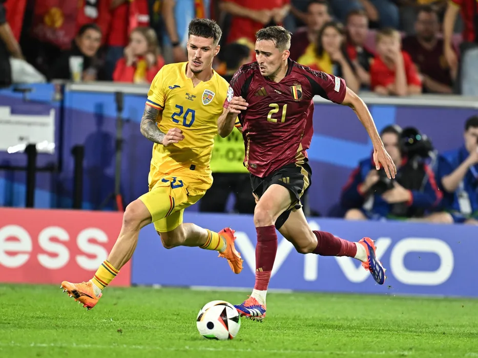 Dennis Man si Timothy Castagne in meciul de fotbal dintre Belgia si Romania, contand pentru UEFA EURO, EM, Europameisterschaft,Fussball 2024, desfasurat pe Stadionul Cologne din Koln, sambata 22 iunie 2024. Koln *** Dennis Man and Timothy Castagne in the UEFA EURO 2024 football match between Belgium and Romania at the Cologne Stadium in Cologne on Saturday 22 June 2024 Cologne Copyright: xRazvanxPasarica/SPORTxPICTURESx,Image: 883964313, License: Rights-managed, Restrictions: Credit images as "Profimedia/ IMAGO", Model Release: no