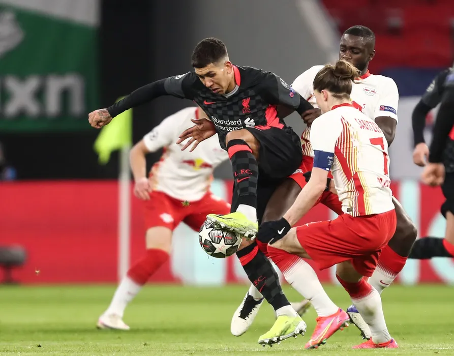 Roberto Firmino of Liverpool challenged by Marcel Sabitzer of RB Leipzig (nearest) and Dayot Upamecano of RB Leipzig