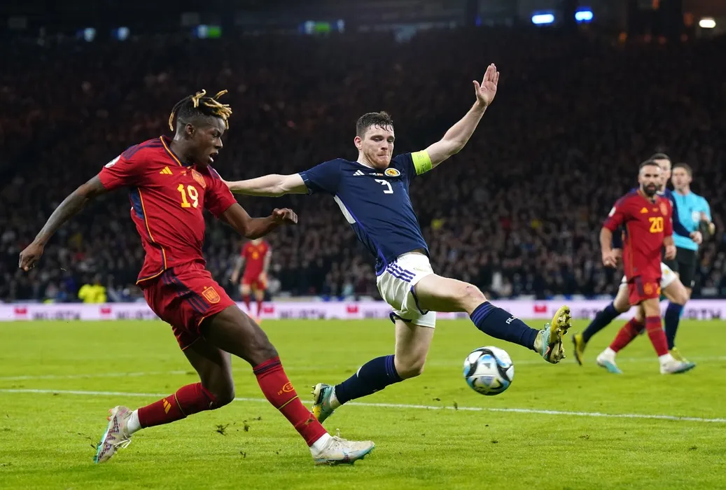 Spain's Nico Williams (left) and Scotland's Andrew Robertson battle for the ball during the UEFA Euro 2024 qualifying group A match at Hampden Park, Glasgow. Picture date: Tuesday March 28, 2023.,Image: 765762138, License: Rights-managed, Restrictions: Use subject to restrictions. Editorial use only, no commercial use without prior consent from rights holder., Model Release: no