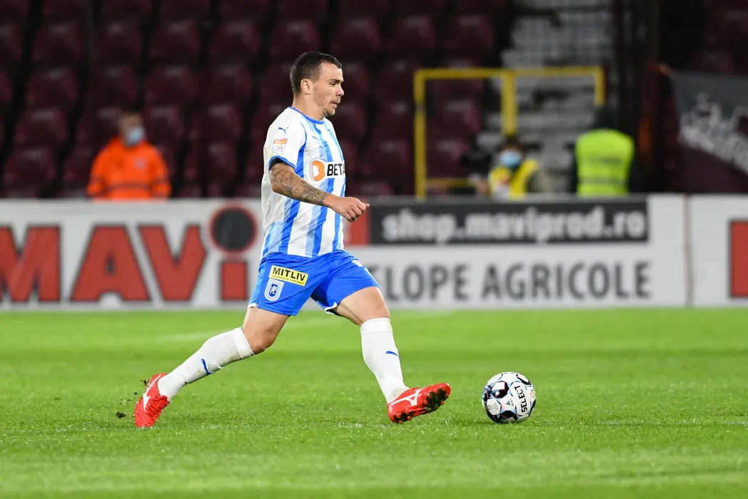 Dan Nisor, de la CS Universitatea Craiova, suteaza in timpul meciului de fotbal contra echipei CFR Cluj din etapa a IX - a a Ligii 1, disputat pe stadionul Dr. Constantin Radulescu, luni, 20 septembrie 2021. FLAVIU BUBOI / MEDIAFAX FOTO