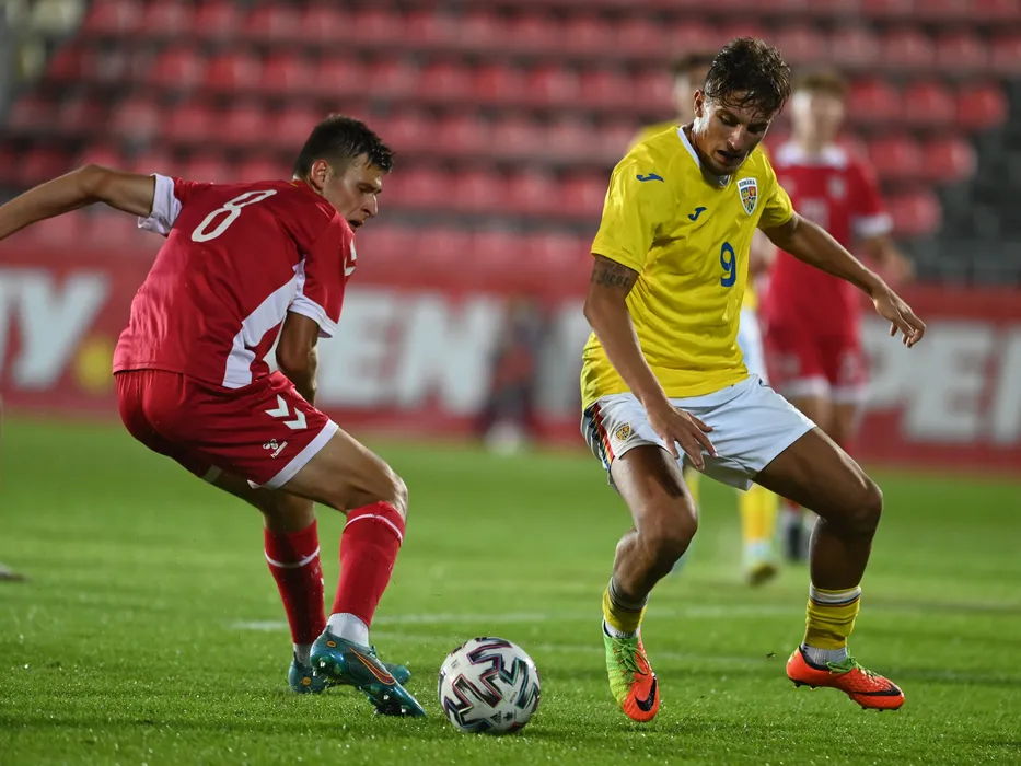 Gvidas Gineitis si Rares Burnete in meciul de fotbal dintre Romania U19 si Lituania U19, din cadrul turneului de calificare pentru Campionatul European 2023, desfasurat pe Stadionul Anghel Iordanescu din Voluntari, sambata 24 septembrie 2022. © FOTO:Razvan Pasarica/SPORT PICTURES