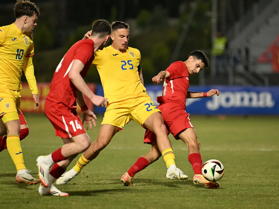 Eduard Radaslavescu, Rareș Burnete si Ilkan Sever in meciul de fotbal dintre Romania U20 si Turcia U20, contand pentru Elite League U20, desfasurat pe Stadionul Eugen Popescu din Targoviste, marti 25 martie 2025. © FOTO:Razvan Pasarica/SPORT PICTURES