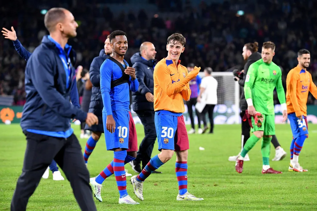 FC Barcelona's Ansu Fati (2nd L) and Gavi (C) acknowledge spectators after their friendly match against A-League All Stars at the Accor Stadium in Sydney on May 25, 2022.,Image: 694382462, License: Rights-managed, Restrictions: -- IMAGE RESTRICTED TO EDITORIAL USE - STRICTLY NO COMMERCIAL USE --, Model Release: no, Credit line: Profimedia
