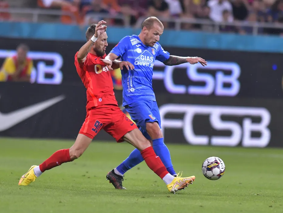 Gheorghe Bogdan Rusu si Modestas Vorobjovas in meciul de fotbal dintre FCSB si Chindia Targoviste, contand pentru Superliga Superbet, desfasurat pe Arena Nationala din Bucuresti, duminica 14 august 2022. © FOTO:Razvan Pasarica/SPORT PICTURES