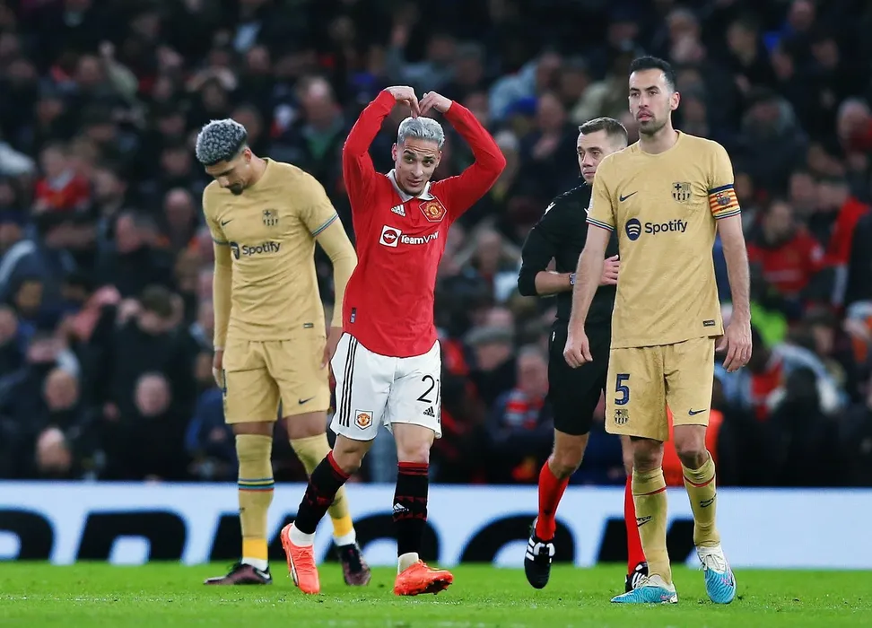 Antony of Manchester United celebrates scoring a goal to make it 2-1 Manchester United v Barcelona, UEFA Europa League, Play-Off Round, Second Leg, Football, Old Trafford, Manchester, UK - 23 Feb 2023,Image: 758206531, License: Rights-managed, Restrictions: EDITORIAL USE ONLY No use with unauthorised audio, video, data, fixture lists, club/league logos or "live" services. Online in-match use limited to 120 images, no video emulation. No use in betting, games or single club/league/player publications., Model Release: no