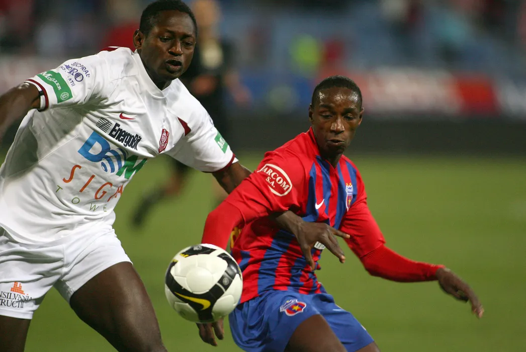 Antonio Semedo (D), de la Steaua Bucuresti, se lupta pentru balon cu Dirrasouba Viera (S), de la CFR Cluj, in meciul din etapa a XXVI-a a Ligii I, disputat in Bucuresti, miercuri, 22 aprilie 2009. RADU VIOREANU / MEDIAFAX FOTO