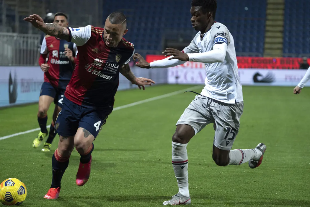 Cagliri's Radja Nainggolan, left, and Bologna's Ibrahima Mbaye compete for the ball during the Serie A soccer match between Cagliari and Bologna at the Sardegna Arena in Cagliari, Italy, Wednesday, March 3, 2021. (Alessandro Tocco/LaPresse via AP)