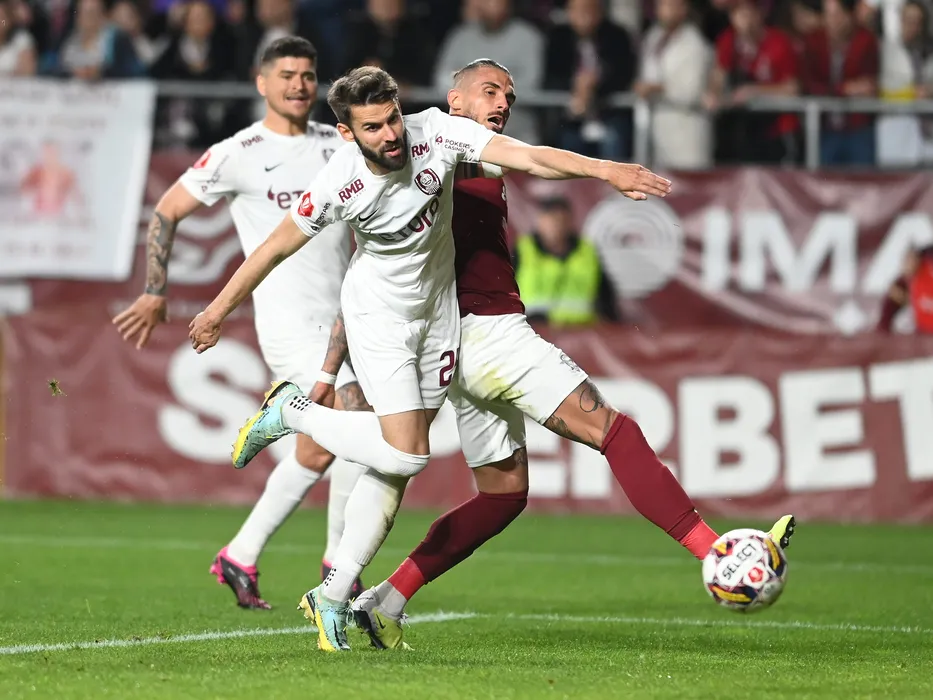 Marko Dugandzic marcheaza un gol de langa Bogdan Ionut Tiru in meciul de fotbal dintre Rapid Bucuresti si CFR Cluj, contand pentru Play-off-ul Superligii Superbet, desfasurat pe Stadionul Rapid Giulesti din Bucuresti, duminica 1 mai 2023. © FOTO:Razvan Pasarica/SPORT PICTURES