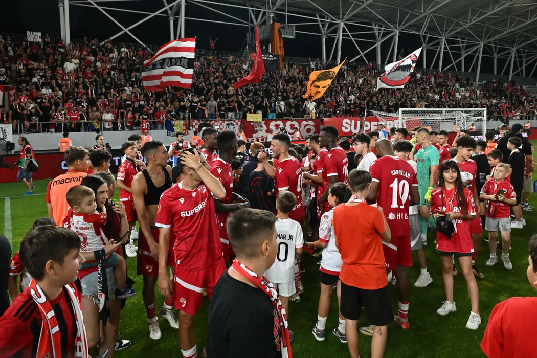 Fotbaliștii dinamoviști salută galeria după meciul de fotbal dintre Dinamo Bucuresti si Petrolul Ploiesti, din cadrul Superligii Superbet, desfasurat pe Stadionul National Arcul de Triumf din Bucuresti, duminica 21 iulie 2024. © FOTO:Razvan Pasarica/SPORT PICTURES