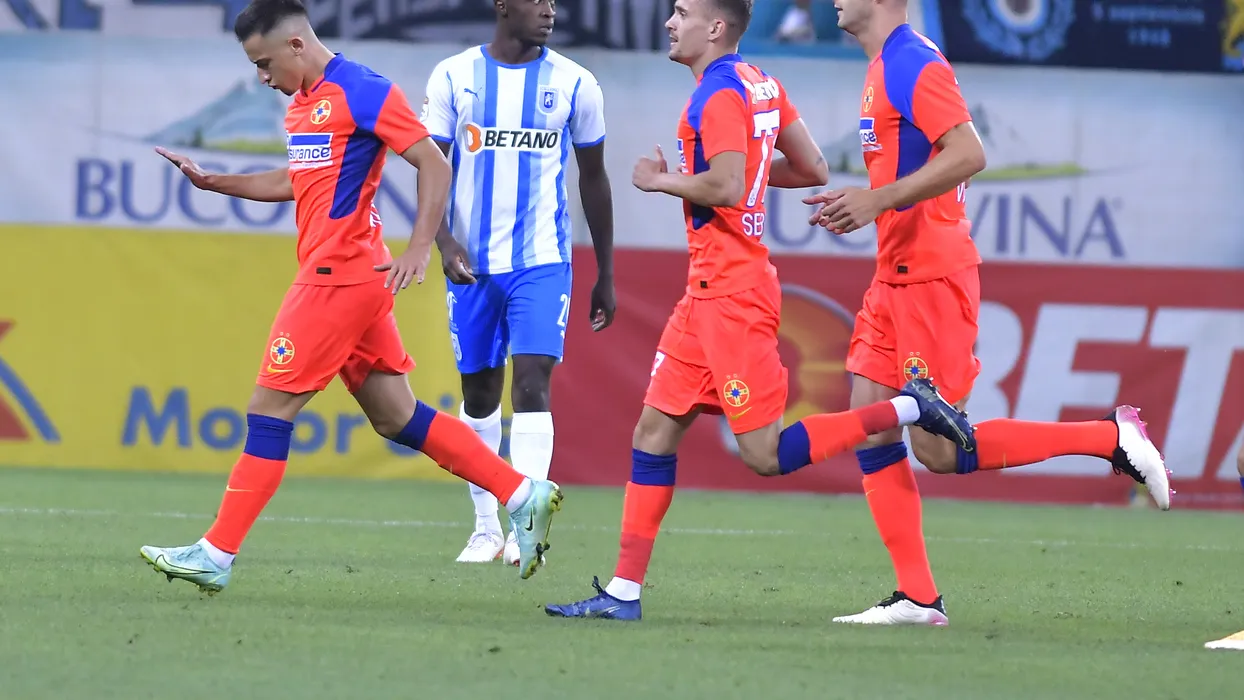 Bucurie a fotbalistilor stelisti dupa un gol marcat cu Stipe Vucur, Ioan Dumiter si Olimpiu Vasile Morutan in meciul de fotbal dintre FCSB si Universitatea Craiova, contand pentru Liga 1 Casa Pariurilor, desfasurat pe Arena Nationala din Bucuresti, duminica 25 iulie 2021. © FOTO:Razvan Pasarica/SPORT PICTURES
