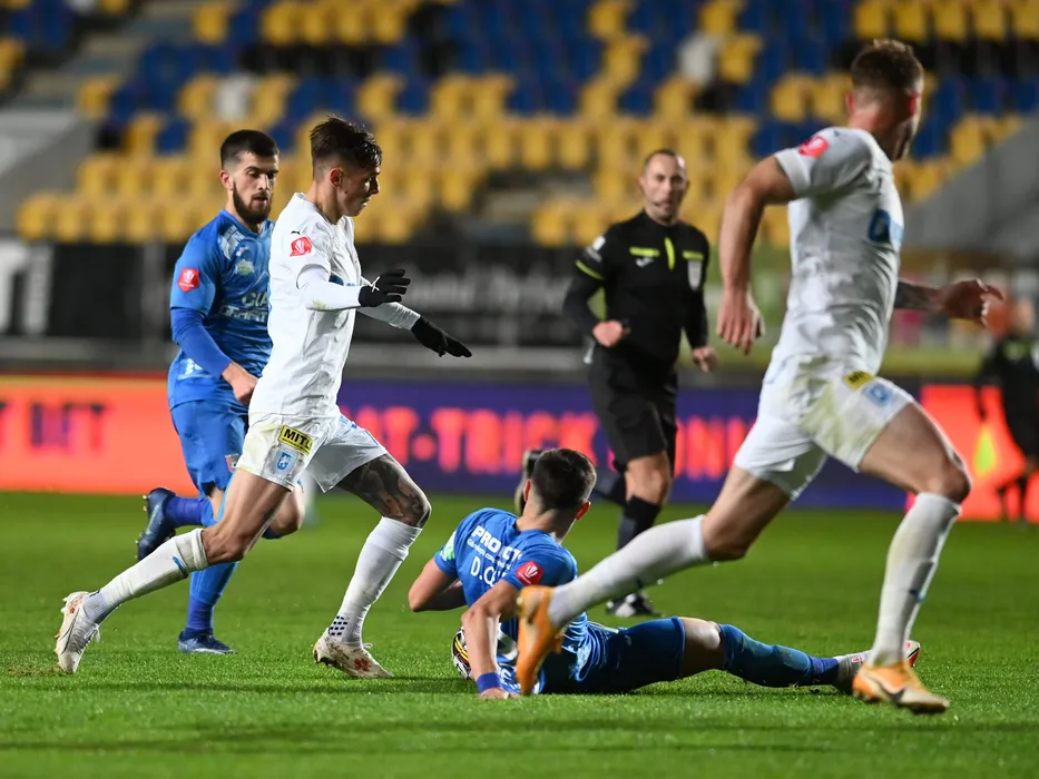 Rassambek Akhmatov si Alexandru George Cimpanu in meciul de fotbal dintre Chindia Targoviste si Universitatea Craiova, contand pentru Superliga Superbet, desfasurat pe Stadionul Ilie Oana din Ploiesti, marti 29 noiembrie 2022. © FOTO:Razvan Pasarica/SPORT PICTURES