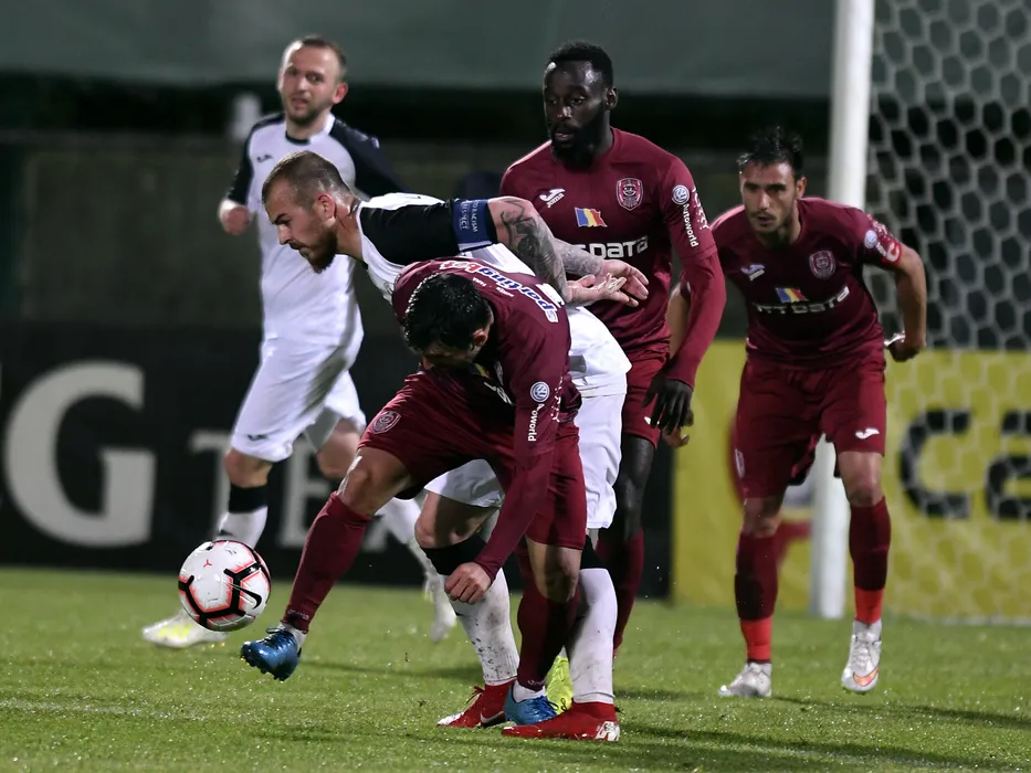 Denis Alibec si Kevin Boli in meciul de fotbal dintre Astra Giurgiu si CFR Cluj, din cadrul playoff-ului Ligii 1 Betano, desfasurat pe Stadionul Marin Anastasovici din Giurgiu, luni 6 mai 2019. © FOTO:Razvan Pasarica/SPORT PICTURES