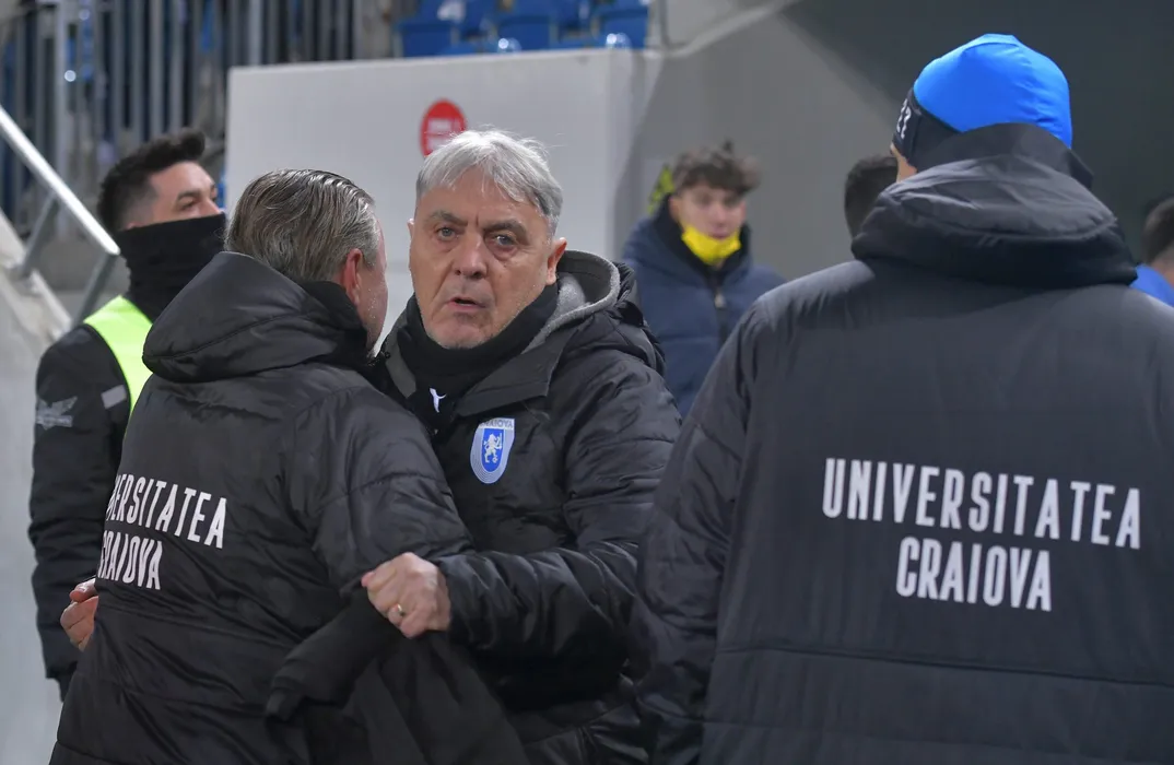 Sorin Cartu il felicita pe Laurentiu Aurelian Reghecampf dupa meciul de fotbal dintre Universitatea Craiova si Farul Constanta, contand pentru Liga 1 Casa Pariurilor, desfasurat pe Stadionul Ion Oblemenco din Craiova, luni 7 martie 2022. © FOTO:Razvan Pasarica/SPORT PICTURES