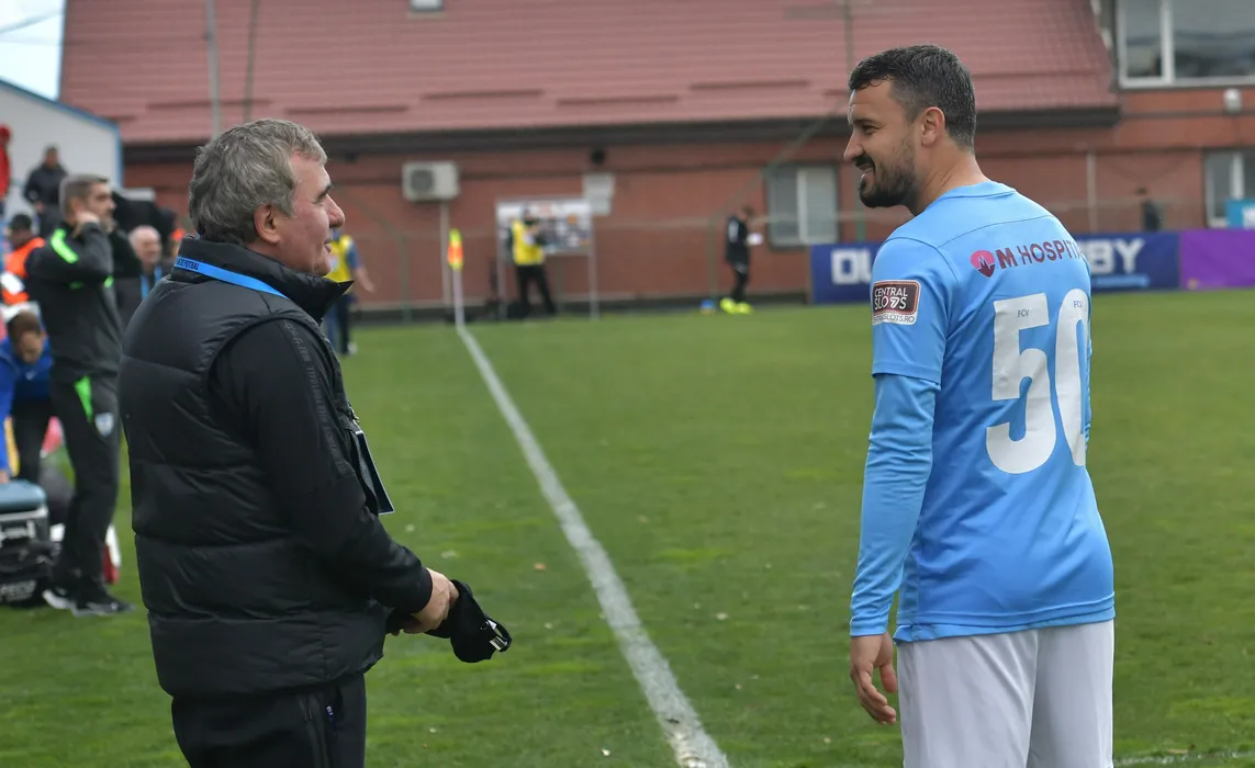 Gheorghe Hagi discuta cu Constantin Valentin Budescu inaintea meciului de fotbal dintre FC Voluntari si Farul Constanta, contand pentru Play-off-ul Ligii 1 Casa Pariurilor, desfasurat pe Stadionul Anghel Iordanescu din Voluntari, sambata 2 aprilie 2022. © FOTO:Razvan Pasarica/SPORT PICTURES