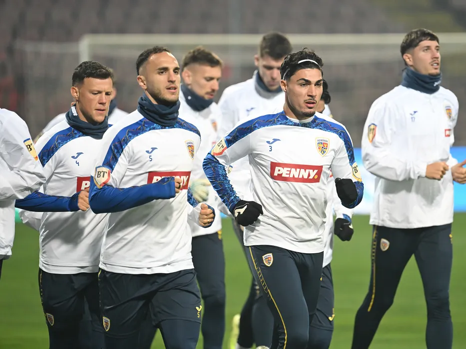 Fotbalistii romani Adrian Rus, Virgil Ghita si Lisav Naif Eissat la antrenamentul oficial efectuat inaintea meciului impotriva Bosniei Hertegovina, din cadrul Preliminariilor Campionatului Mondial 2026, desfasurat pe Stadionul Bilino Polje din Zilina, vineri 14 noiembrie 2025. © FOTO:Razvan Pasarica/SPORT PICTURES