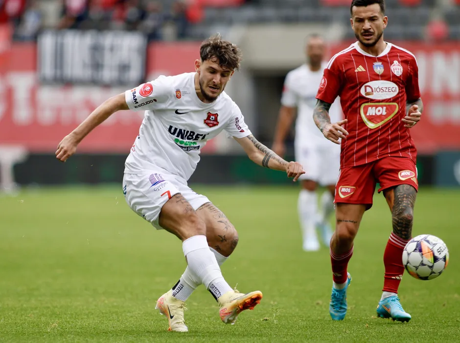 Ianis Ilie Stoica și Cosmin Gabriel Matei în meciul de fotbal dintre AFC Hermannstadt Sibiu si Sepsi OSK Sfântu Gheorghe, petru Superliga Superbet, desfășurat pe Stadionul Municipal din Sibiu, duminică 6 octombrie 2024. © FOTO: Ovidiu MATIU/SPORT PICTURES