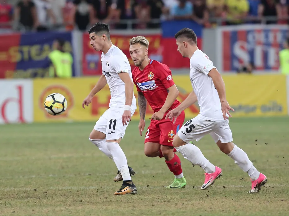 Valentin Gheorghe (S), Catalin Golofca (C) si Romario Moise (D) in meciul de fotbal dintre FCSB si Astra Giurgiu, din etapa a VI-a a Ligii 1, disputat pe stadionul Arena Nationala din Bucuresti, sambata, 12 august 2017. STEFAN CONSTANTIN / SPORT PICTURES