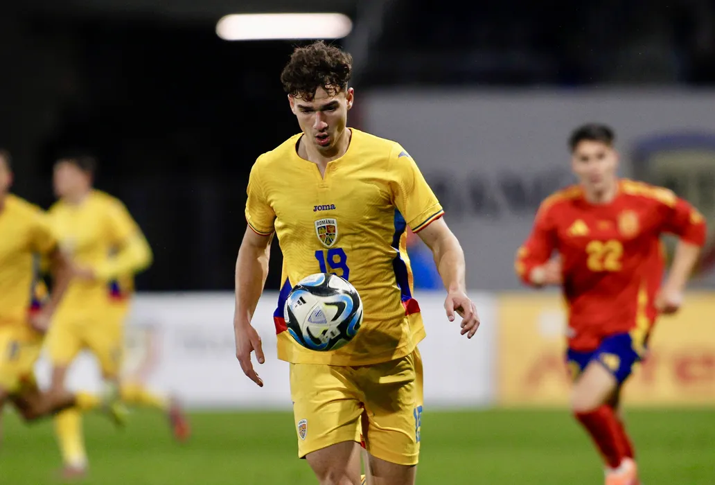 Kevin Ciubotaru, de la echipa nationala a Romaniei U21, suteaza in timpul meciului de fotbal contra selectionatei Spania U21 din preliminariile EURO 2027, disputat pe stadionul Municipal din Sibiu, marti, 18 octombrie 2025. OVIDIU MATIU / MEDIAFAX FOTO
