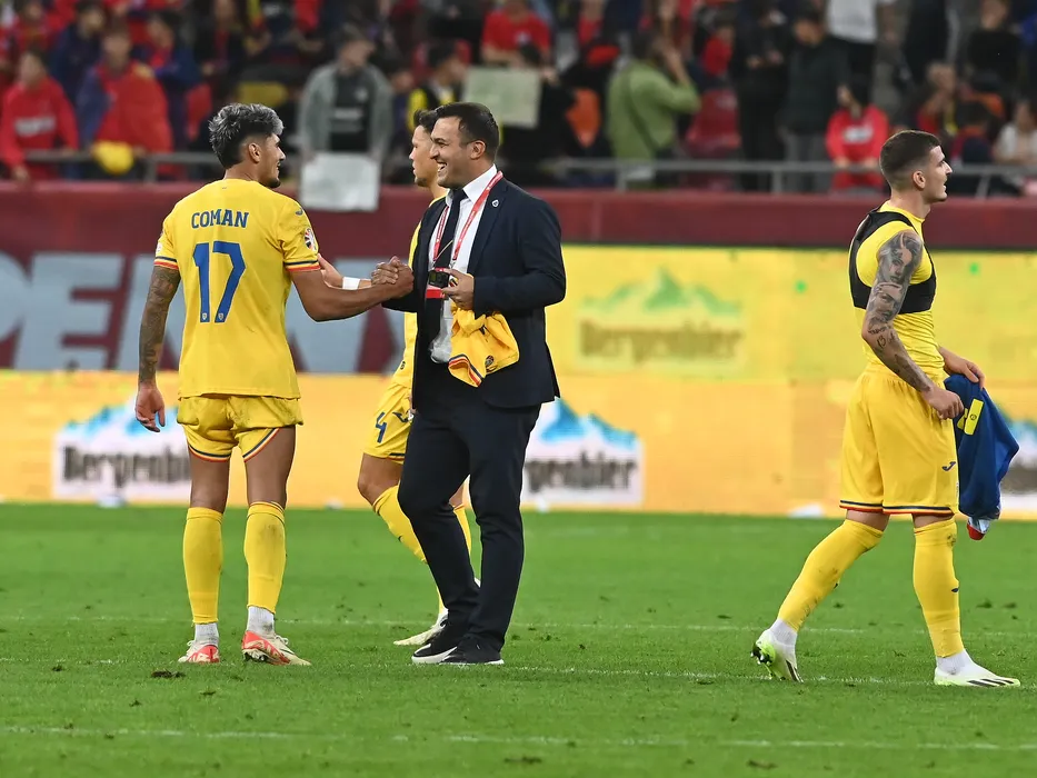 Catalin Popescu il felicita pe Florinel Coman dupa meciul de fotbal dintre Romania si Andorra, din cadrul preliminariilor Campionatului European 2024, desfasurat pe Arena Nationala, duminica 15 octombrie 2023. © FOTO:Razvan Pasarica/SPORT PICTURES