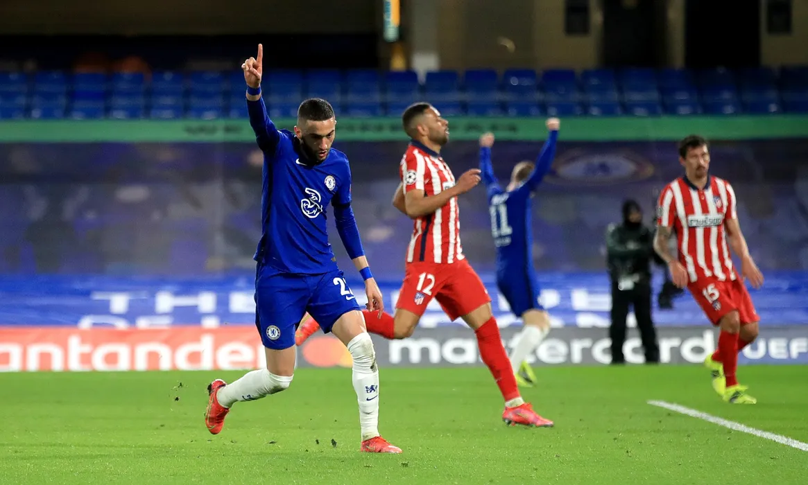 Chelsea's Hakim Ziyech celebrates scoring their side's first goal of the game during the Champions League round of 16 second leg match at Stamford Bridge, London. Picture date: Wednesday March 17, 2021.,Image: 598487428, License: Rights-managed, Restrictions: Editorial use only, no commercial use without prior consent from rights holder., Model Release: no