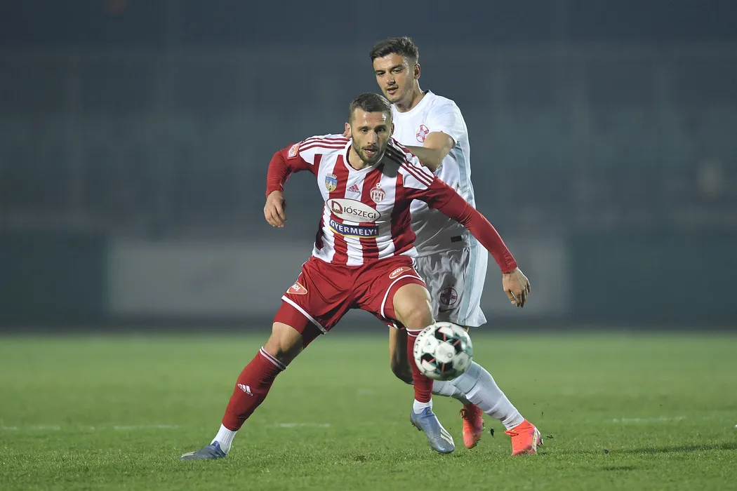 Pavol Safranko (S), de la Sepsi OSK, lupta pentru balon cu Dragos Nedelcu (D), de la FCSB, in meciul de fotbal din etapa 30 a Ligii 1, disputat pe stadionul Municipal din Sfantu Gheorghe, sambata, 10 aprilie 2021. ALEX NICODIM / MEDIAFAX FOTO