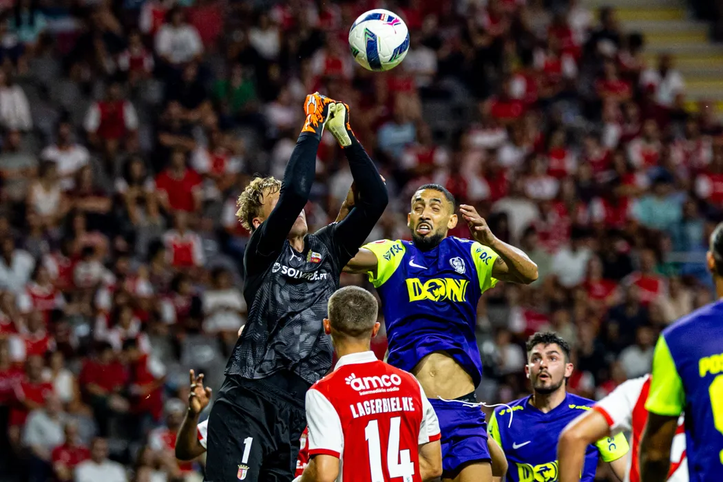 Leonardo Da Costa Bolgado si Lukáš Horníček in meciul de fotbal dintre SC Braga si FC CFR 1907 Cluj, contand pentru UEFA League Turul 3 preliminar, desfasurat pe Estádio Municipal de Braga din Braga, joi 14 august 2025. © FOTO:Tamas Horvath/SPORT PICTURES