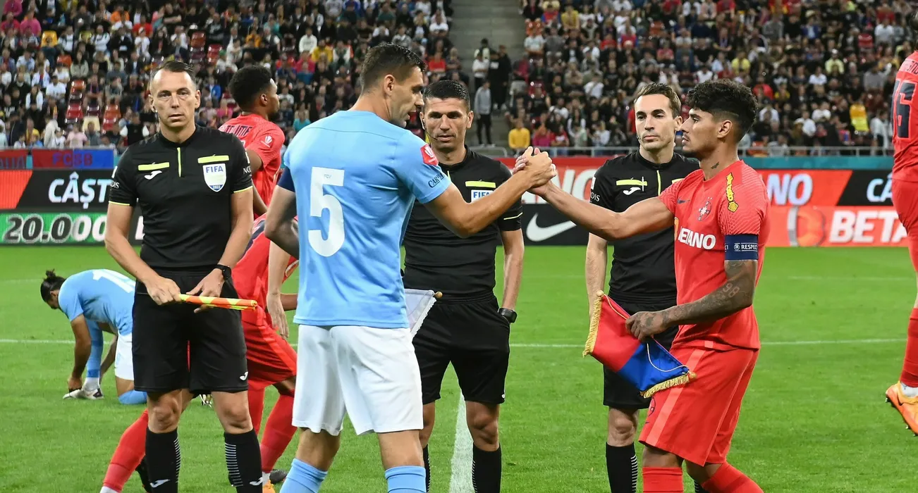 Brigada de arbitrii formata din Mihai Marius Marica, Marcel Birsan si Radu Adrian Ghinguleac alaturi de capitanii Igor Armas si Florinel Teodor Coman in meciul de fotbal dintre FCSB si FC Voluntari, contand pentru Superliga Superbet, desfasurat pe Arena Nationala din Bucuresti, luni 12 septembrie 2022. © FOTO:Razvan Pasarica/SPORT PICTURES
