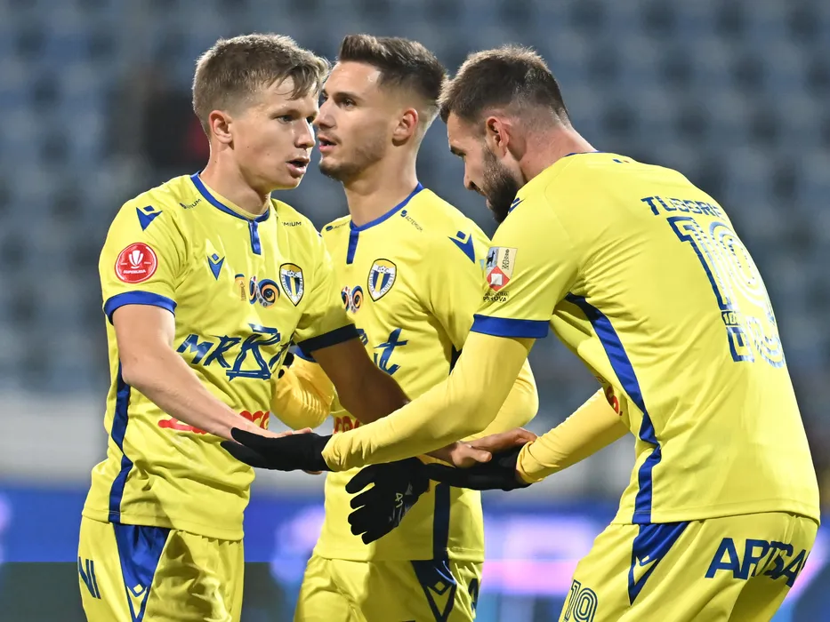 Alexandru Tudorie ii multumeste lui Tommi Matti Jyry pentru pasa de gol sub privirile lui Mihnea Gabriel Radulescu in meciul de fotbal dintre Gloria Buzau si Petrolul Ploiesti, contand pentru Superliga Superbet, desfasurat pe Stadionul Municipal din Buzau, luni 11 noiembrie 2024. © FOTO:Razvan Pasarica/SPORT PICTURES