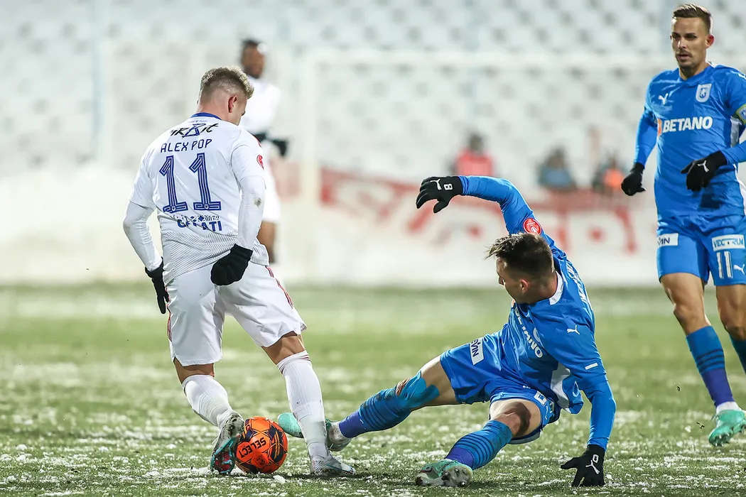 Alexandru Mateiu, Nicușor Silviu Bancu și Alexandru Mihai Constantin Pop în meciul de fotbal dintre ACS SUPORTER CLUB OTELUL GALATI si UNIVERSITATEA CRAIOVA, contând pentru Superliga Superbet, desfășurat pe Stadionul Oțelul din Galați, duminică 26 noiembrie 2023. © FOTO: Sorin PANĂ/SPORT PICTURES