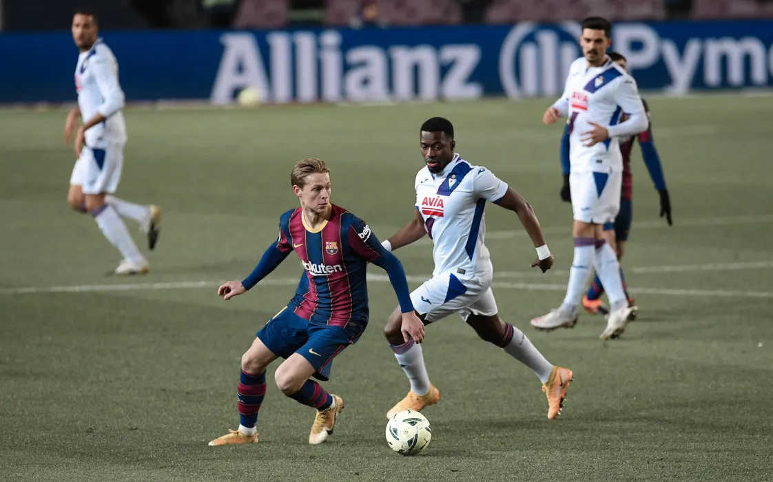 BARCELONA, SPAIN - DECEMBER 29: Frenkie De Jong of Barcelona runs past Papakouly Diop of SD Eibar during the La Liga Santander match between FC Barcelona and SD Eibar at Camp Nou on December 29, 2020 in Barcelona, Spain. Sporting stadiums around Spain remain under strict restrictions due to the Coronavirus Pandemic as Government social distancing laws prohibit fans inside venues resulting in games being played behind closed doors. (Photo by Alex Caparros/Getty Images)