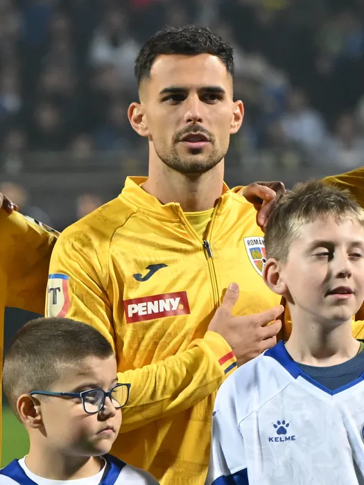 Marius Marin la intonarea imnului national de dinainrea meciului de fotbal dintre Bosnia Hertegovina si Romania, din cadrul Preliminariilor Campionatului Mondial 2026, desfasurat pe Stadionul Bilino Polje din Zilina, sambata 15 noiembrie 2025. © FOTO:Razvan Pasarica/SPORT PICTURES