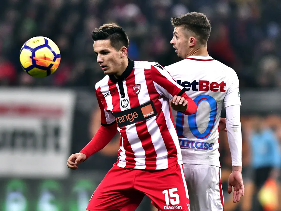 Vlad Alexandru Olteanu si Florin Tanase in meciul de fotbal dintre Dinamo Bucuresti si FC Steaua Bucuresti, contand pentru Liga 1 Betano, desfasurat pe Arena Nationala din Bucuresti, duminica 18 februarie 2018. © FOTO Razvan Pasarica/SPORT PICTURES