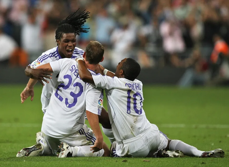 Real Madrid's Dutch Wesley Sneijder (C) celebrates with teamates Dutch Royston Drenthe (L) and Brazilian Robinho (R) after Arjen Robben scored the victory goal against Atletico Madrid during their Spanish league football match at Santiago Bernabeu stadium, 25 August 2007 in Madrid.,Image: 22296571, License: Rights-managed, Restrictions: , Model Release: no
