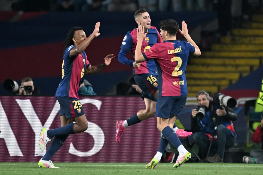 09 April 2025, Spain, Barcelona: (L-R) Barcelona's Jules Kounde, Fermin Lopez and Pau Cubarsi celebrate their side's first goal during the UEFA Champions League quarter-final first leg soccer match between FC Barcelona and Borussia Dortmund at Olimpic Lluis Companys. Photo: Federico Gambarini/dpa