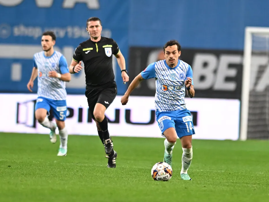 Arbitrul central Adrian Viorel Cojocaru alături de Lyes Hafid Houri in meciul de fotbal dintre Universitatea Craiova si FC Voluntari, contând pentru Superliga Superbet, desfășurat pe Stadionul Ion Oblemenco din Craiova, luni 26 februarie 2024. © FOTO: Răzvan PĂSĂRICĂ/SPORT PICTURES