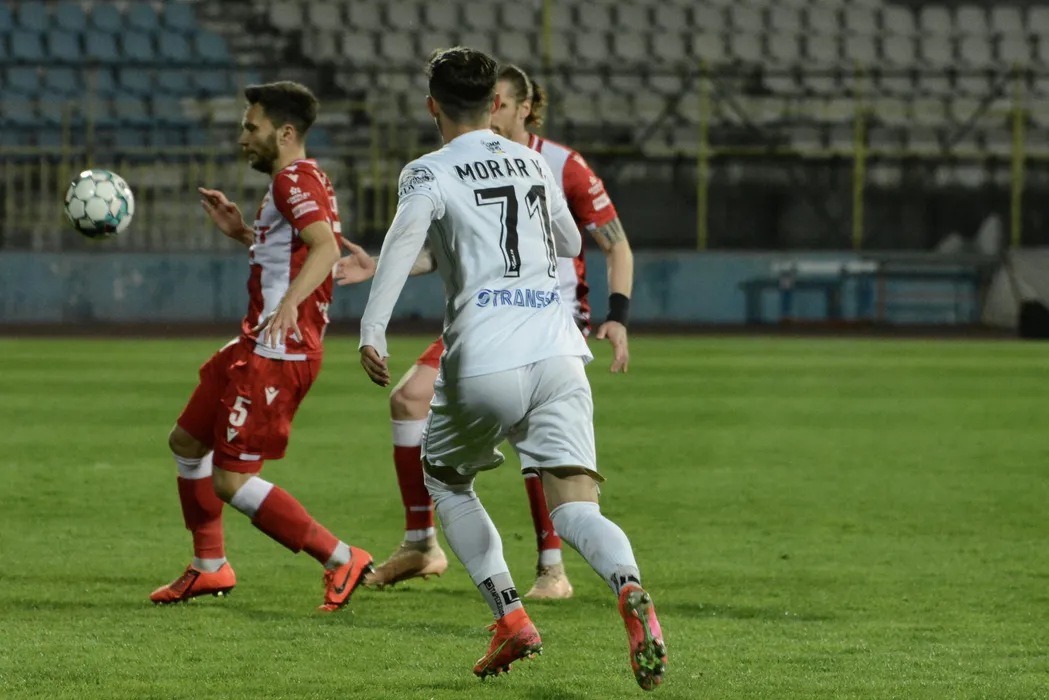 Echipele Gaz Metan si Dinamo (echipament alb-rosu) s-au intalnit intr-o partida disputata in runda a 3-a a play-out-ului din Liga 1 la fotbal, vineri, 23 aprilie 2021, la Medias. LUCIAN DANCIU / MEDIAFAX FOTO