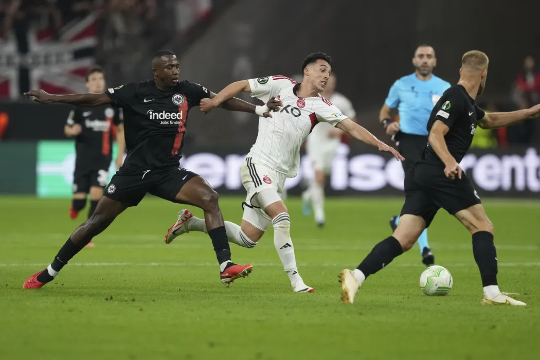 Aberdeen's Aberdeen's Bojan Miovski, right, and Frankfurt's Willian Pacho challenge for the ball during a Conference League Group G match between Eintracht Frankfurt and FC Aberdeen in Frankfurt, Germany, Wednesday, Sept. 20, 2023. (AP Photo/Michael Probst)