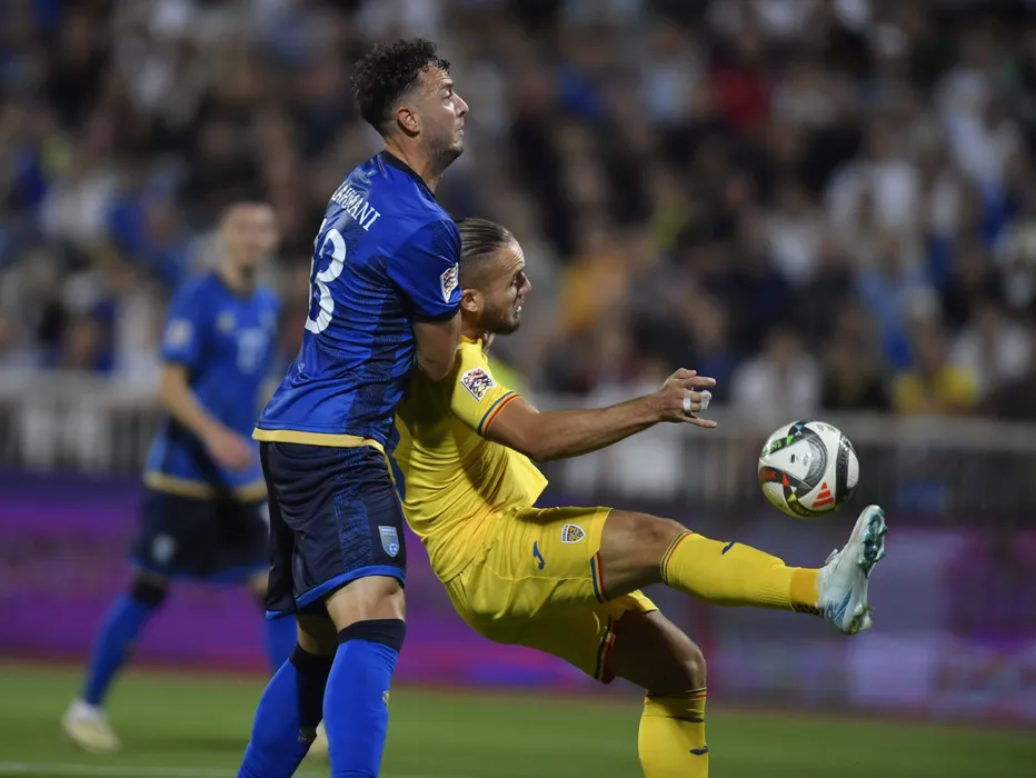 George Pușcaș și Amir Rrahmani în meciul de fotbal dintre Kosovo și România, contând pentru Liga Națiunilor, desfășurat pe Stadionul Fadil Vokrri din Priștina, vineri 6 septembrie 2024. © FOTO: SPORT PICTURES