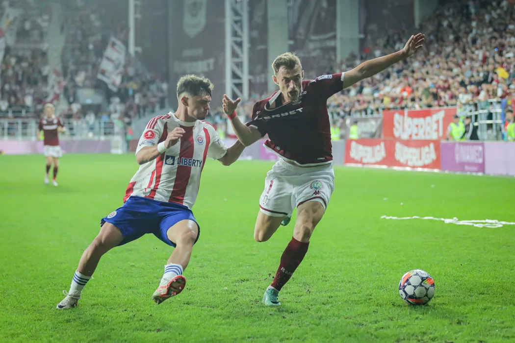David Iulian Maftei si Claudiu Valentin Micovschi in meciul de fotbal dintre Rapid Bucuresti si Otelul Galati, din cadrul Superligii Superbet, desfasurat pe Superbet Arena-Giulesti din Bucuresti, sambata 28 septembrie 2024. © FOTO:Mihai Antonio Vasile/SPORT PICTURES
