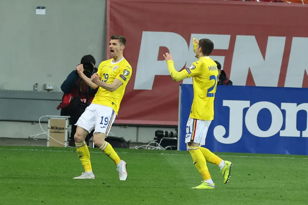Reprezentativele Romaniei (echipament galben) si Macedoniei de Nord s-au intalnit intr-o partida contand pentru preliminariile CM 2022, joi 25 noiembrie 2021, pe Arena Nationala din Bucuresti. GEORGE FLUSTER / MEDIAFAX FOTO