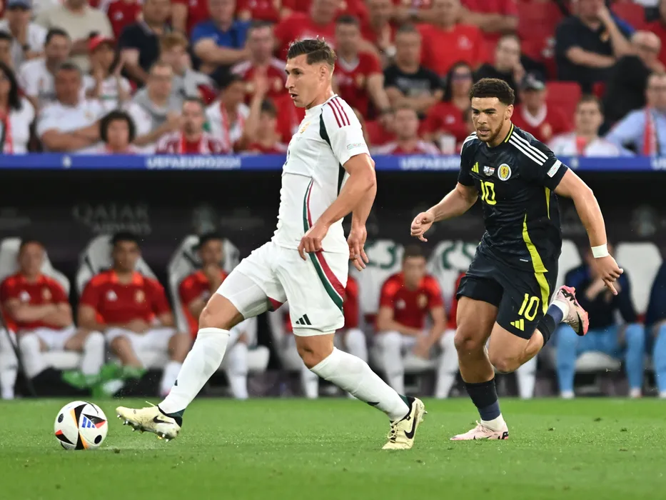 Willi Orbán si Ché Adams in meciul de fotbal dintre Scotia si Ungaria, contand pentru UEFA EURO 2024, desfasurat pe Stuttgart Arena din Stuttgart, duminica 23 iunie 2024. © FOTO:Razvan Pasarica/SPORT PICTURES