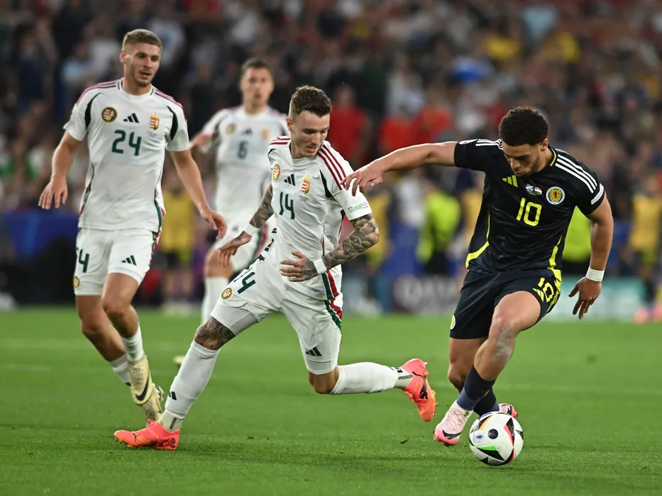Márton Dárdai, Ché Adams si Bendegúz Bolla in meciul de fotbal dintre Scotia si Ungaria, contand pentru UEFA EURO 2024, desfasurat pe Stuttgart Arena din Stuttgart, duminica 23 iunie 2024. © FOTO:Razvan Pasarica/SPORT PICTURES