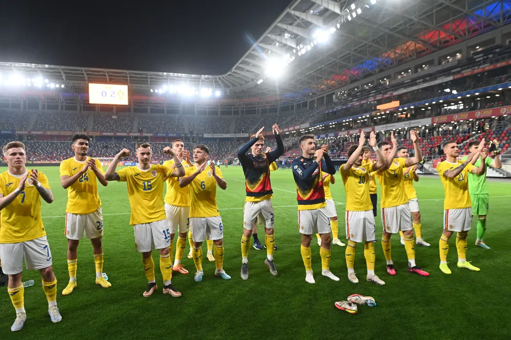 Fotbalistii romani Claudiu Petrila, Ștefan Baiaram, Alexandru Pantea, Dragoș Albu, Andres Dumitrescu si Daniel Birligea saluta publicul dupa meciul amical de fotbal dintre Romania U21 si Portugalia U21, desfasurat pe Stadionul Steaua din Bucuresti, vineri 24 martie 2023. © FOTO:Razvan Pasarica/SPORT PICTURES