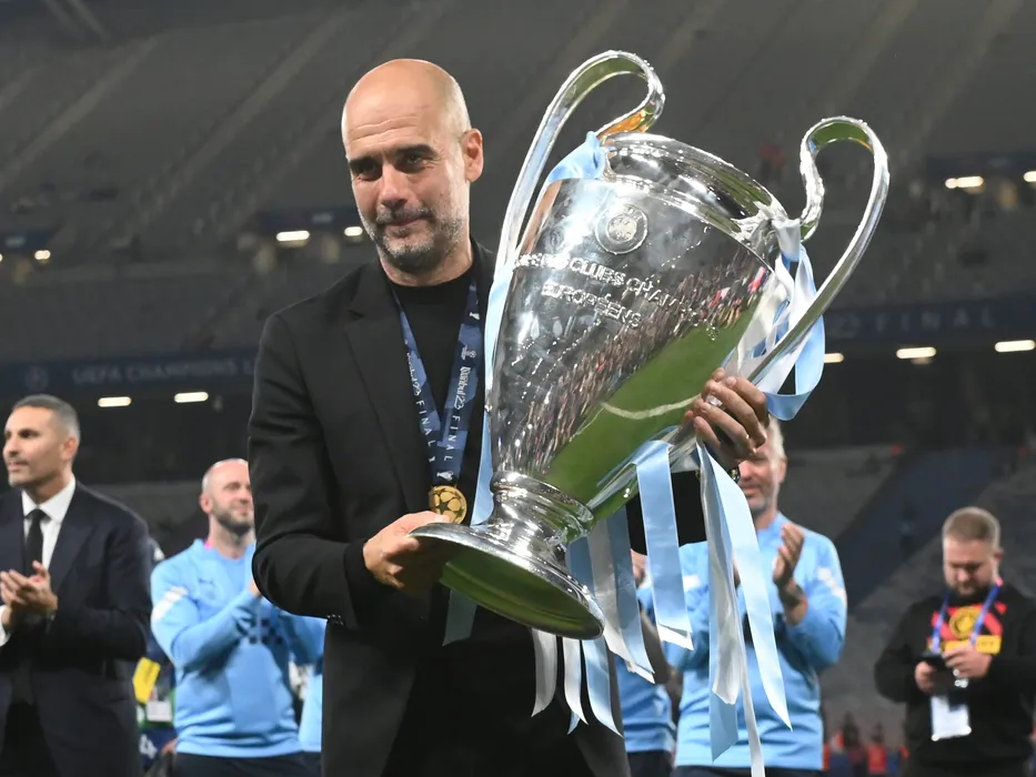 Josep Guardiola pozeaza alaturi de trofeu dupa castigarea competitiei in urma meciului de fotbal dintre Manchester City si FC Internazionale Milano, finala Ligii Campionilor, desfasurat pe Stadionul Olimpic Ataturk din Istanbul, sambata 10 iunie 2023. © FOTO:Razvan Pasarica/SPORT PICTURES