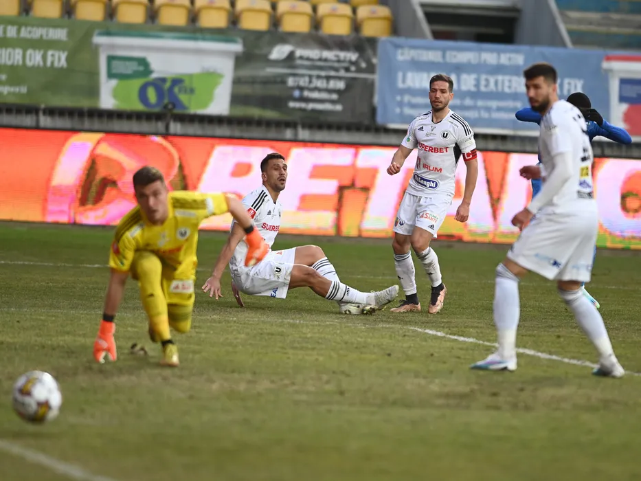 Denis Florentin Ispas si Mihaita Alexandru Chipciu in meciul de fotbal dintre Chindia Targoviste si Universitatea Cluj, contand pentru Superliga Superbet, desfasurat pe Stadionul Ilie Oana din Ploiesti, vineri 17 februarie 2023. © FOTO:Razvan Pasarica/SPORT PICTURES