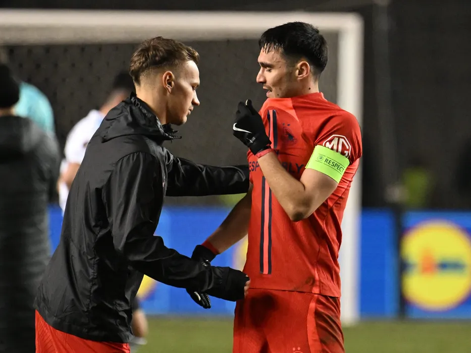 Adrian Gheorghe Șut reacționează alături de Grigoraș Alexandru Pantea dupa meciul de fotbal dintre Qarabag si FCSB, din cadrul UEFA Europa League, desfasurat pe Stadionul Republican Tofiq Bahramov din Baku, joi 23 ianuarie 2025. © FOTO:Razvan Pasarica/SPORT PICTURES